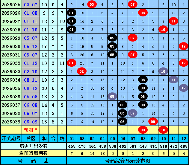 后区别析【一区01-04,二区05-08,三区09-12】:上期后区奖号为06和09,分别落在第二、三区,近50期后区三区比为29:43:28,近10期三区比为2:12:6,本期留心第二、三区号码出现,温雅两码08+10。