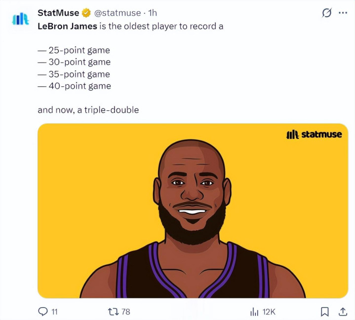 数据媒体Statmuse写谈:詹姆斯从最年长单场25+、单场30+、单场35+、单场40+到单场三双。勒布朗-詹姆斯自最年青的记载到最年长记载齐总揽了一个遍。