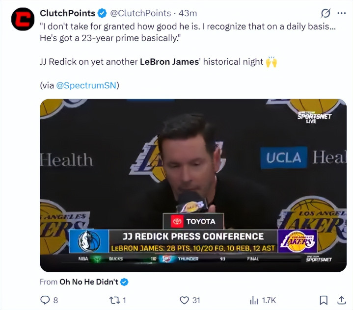 雷迪克赛后谈到詹姆斯:我从来莫得把勒布朗的弘扬当成理所诚然,但我每天齐有切实的感受,他仍处于做事活命的巅峰期,他依然在巅峰23年之深切。