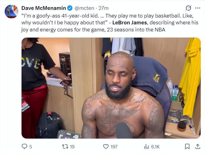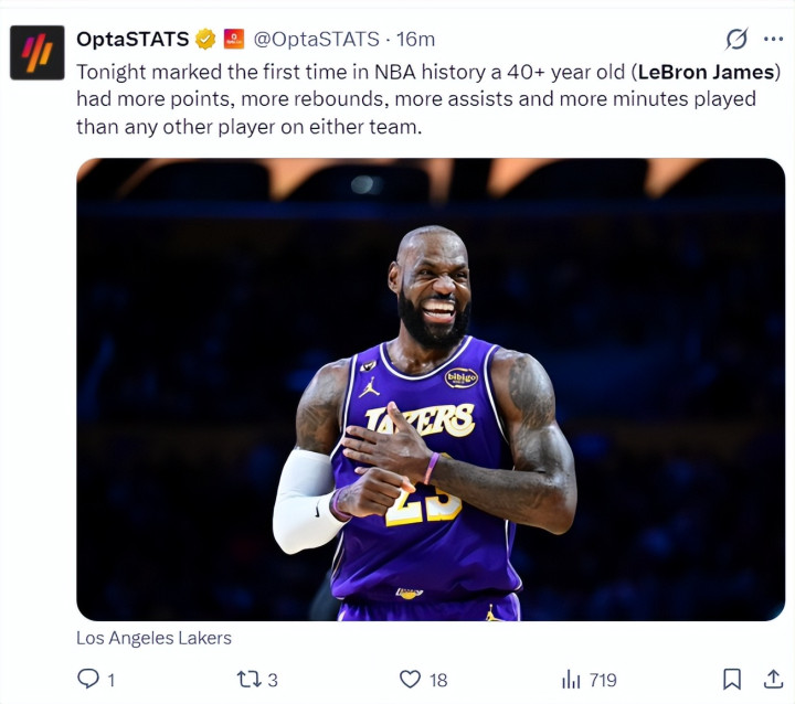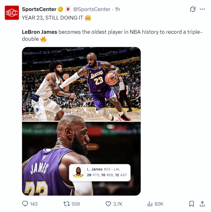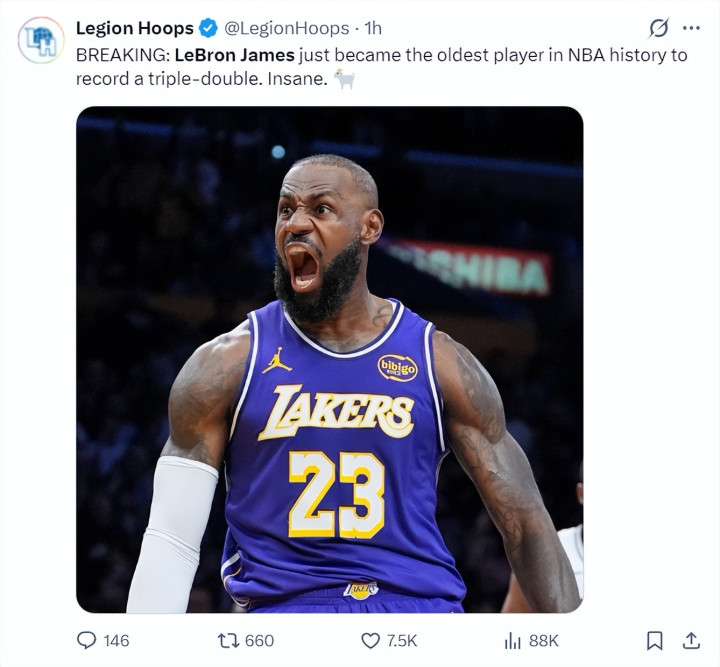 好意思媒LH写谈勒布朗成为历史最年长的三双球员,GOAT。