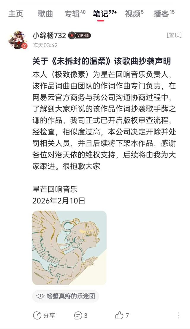 2月10日,星芒回响音乐负责东说念主发布声明称,该作品词曲由团队的作词作曲特意负责,了解到全球所说的该作品作词抄袭歌手薛之谦的作品,我司已持重开启版权审查历程,经检查,相同渡过高,本公司决定开除并搞定干系东说念主员,况兼后续将下架本作品,感谢诸位对洛天依的维权支援。