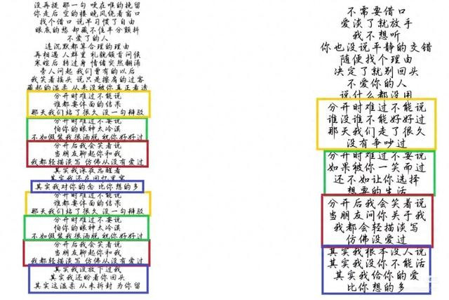 记者发现,《其实》中的部分歌词被如法泡制地照搬,如“分开时痛心不成说”“分开后我会笑着说”等。部分歌词则在原句基础上进行了调动,举例“其实我给你的爱比你思的多”被改为“其实我对你的念比你思的多”。