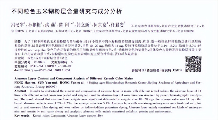 不同粒色玉米糊粉层含量辩论与因素分析 冯汉宇,孙艳梅,洪 燕,陈 刚,韩立新,何京京 ,任君安 安徽农业科学 2019-11-12