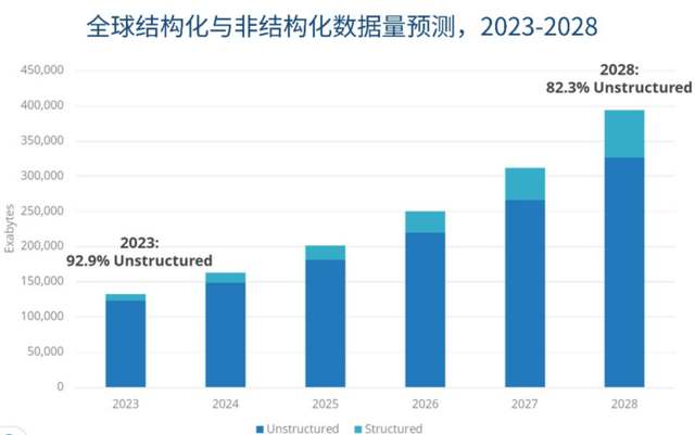 证实IDC 2023年的求教,视频、音频、图片等非结构化数据占到了全球数据总量的92.9%,即便到2028年,这个比例瞻望也只会降到82.3%。