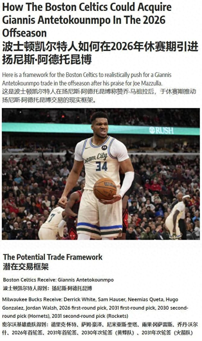 研讨到字母哥和雄鹿基本还是闹僵,再加上此前前者表态可爱凯尔特东说念主的赢球文化。基于此,好意思媒《FW》提出凯尔特东说念主9换1报价字母哥。