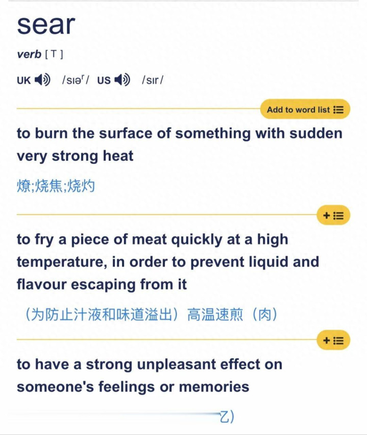 Sear 手脚动词,其中枢含义是"高温快速烧灼名义",既可指烹调中的煎和烙,也可指烧伤,烫伤等躯壳上的伤害,还可扩展为心扉上的深切缅想。