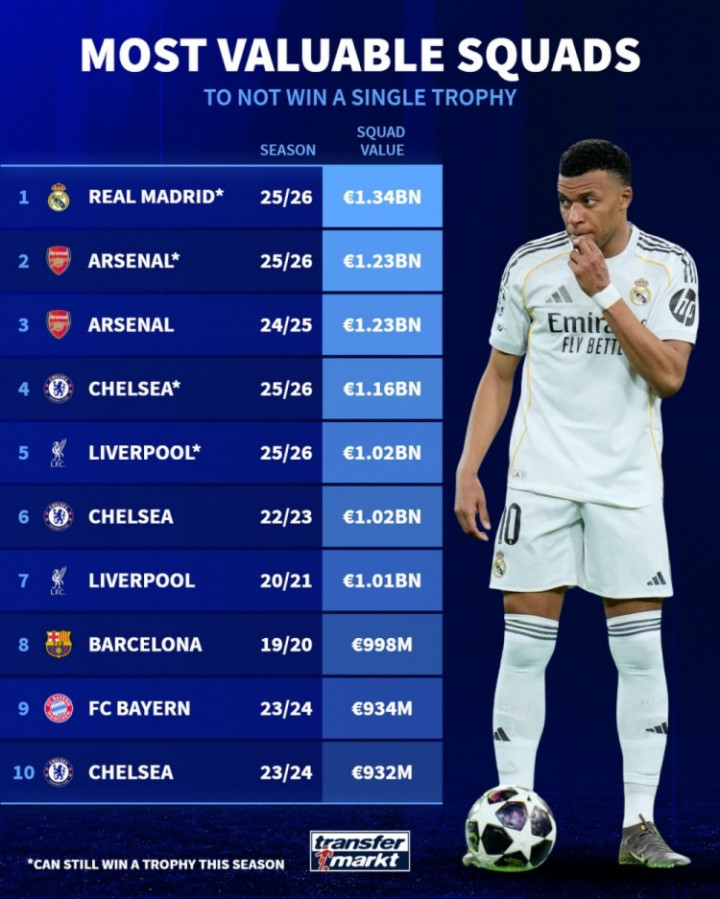 直播吧4月27日讯德国转会阛阓列出了无冠球队身价名次,如若皇马、阿森纳本赛季无缘冠军,开云sports将名次前两位。