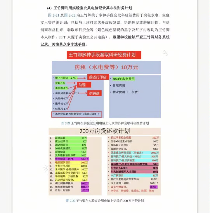 学生举报称,王竹卿甚而在施行室的电脑上列出了其个东谈主一个200万房贷的还款探讨,其中就包括他参与的各个方式所获收益,由此可见他的脑子念念的全是何如捞钱。