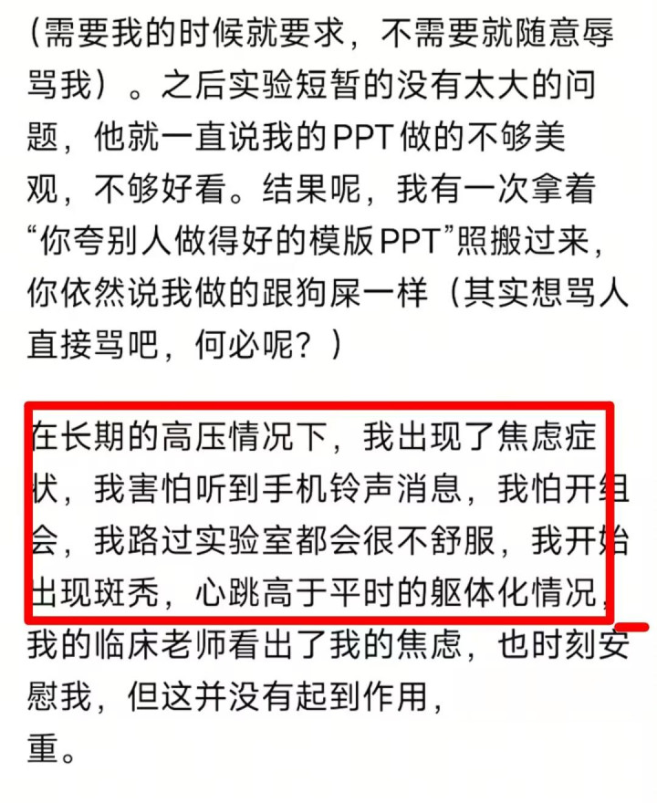 恒久在这种环境放学习职责,导致该网友出现了严重的惊惶心情,平时发怵听笔直机铃声,就连途经施行室心里王人会至极膈应,连医师介入后也莫得获得缓解。