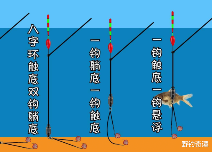 以调三钓三为例,若是饵料分量大于单钩分量,常常会出现一钩躺底一钩触底的情景。当饵料分量小于单钩分量时,则可能变成一钩触底一钩悬浮的情况。