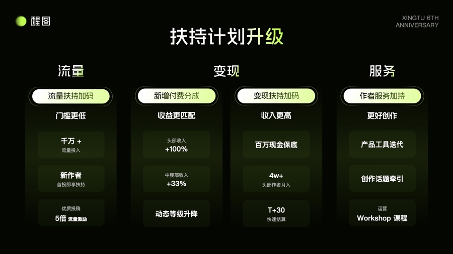这次追随新址品发布,醒图同步推出了全新升级的创作家生态扶合手野心,从流量激发、买卖变现、成长行状三大维度,为平台创作家提供全周期撑合手。