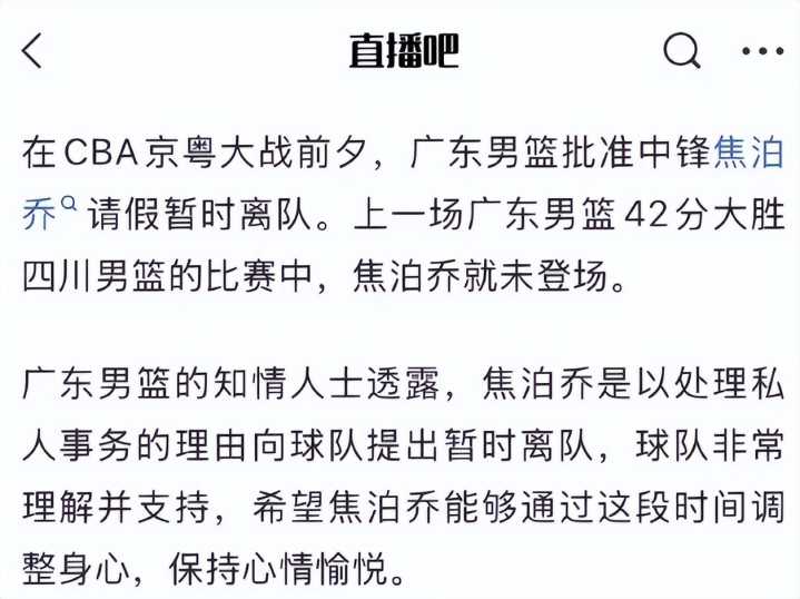 广东队知情东说念主士默示但愿焦泊乔在请假时期大要调遣好身心,保合腕脸色愉悦......相配有信息量,难说念简直如听说中所说的那般不欣喜?