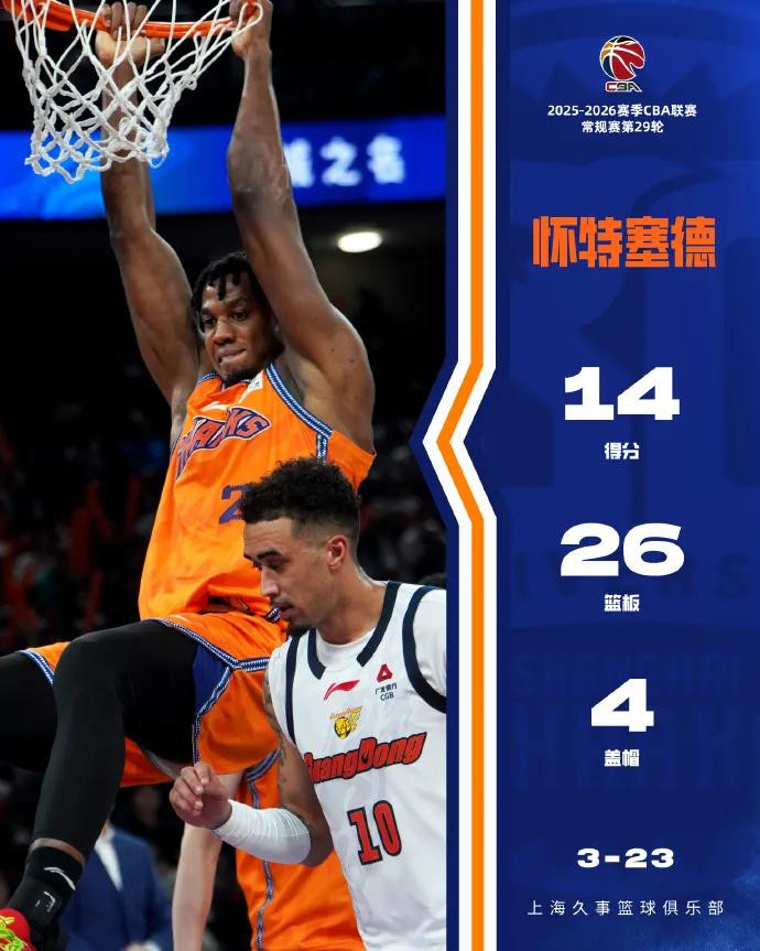前几天上海队主场97-81碾压广东队比赛,36岁的白边狂抢26板(8前场板)外加14分4帽。