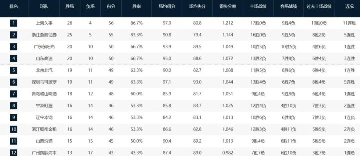 当今兑现,上海队26胜4负高居定约榜首,卫冕冠军广厦队25胜5负第二,广东队20胜10负第三,山东队雷同20胜10负第四,北京队19胜11负名按次五。