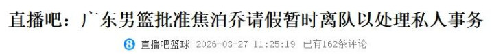 国内有名篮球平台报说念:广东男篮批准焦泊乔请假暂时离队以惩处私东说念主事务。